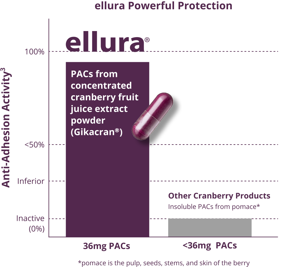 - Clinical research shows that only supplements with the highest levels of soluble PACs, like ellura, deliver powerful urinary tract defense (6).